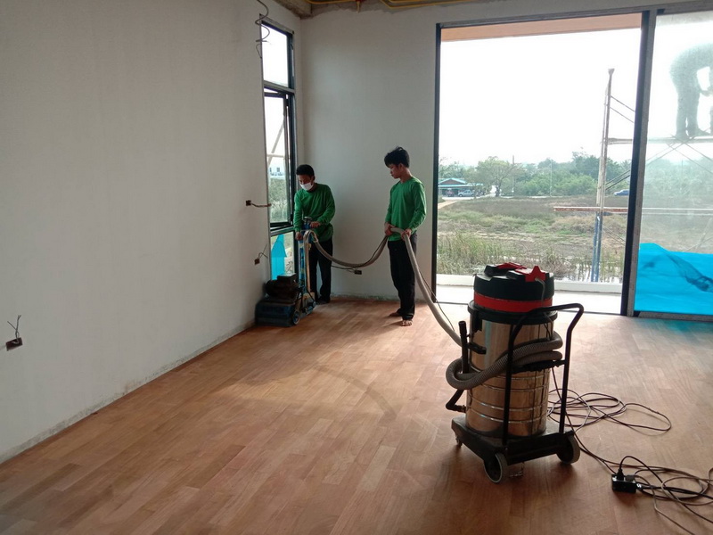 (1).ปูด้วยกาวปาร์เก้ ทิ้งระยะ 7-14 วัน จึงทำการขัดด้วยเครื่อง และทาเคลือบยูรีเทน